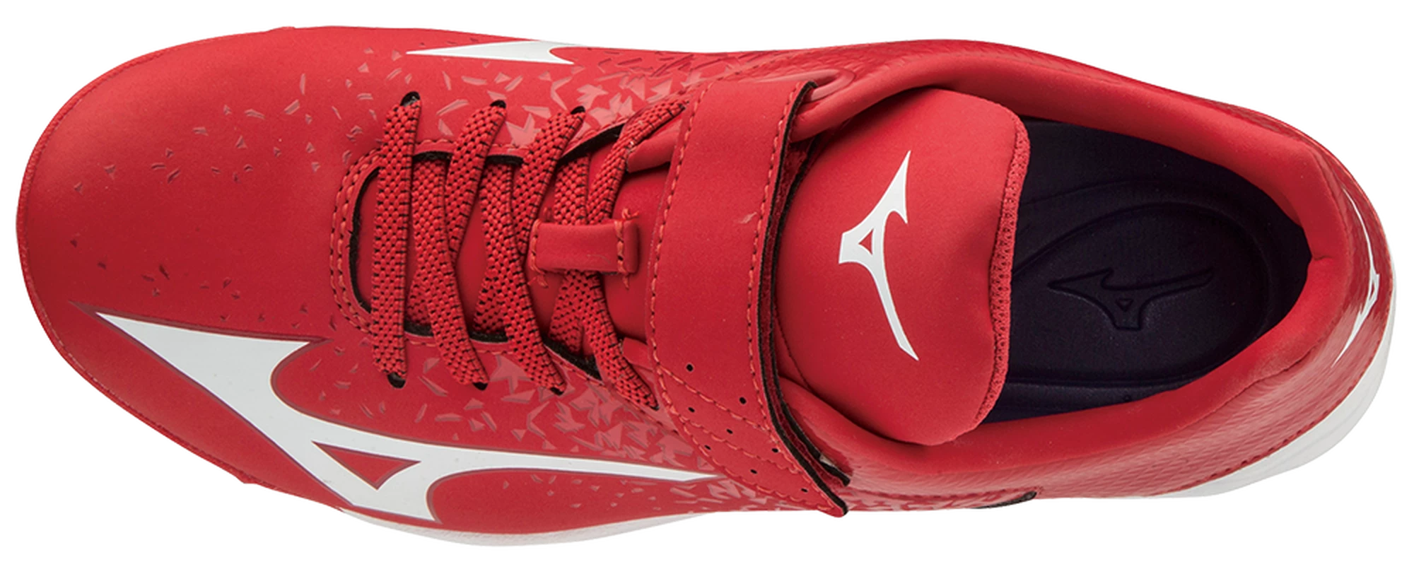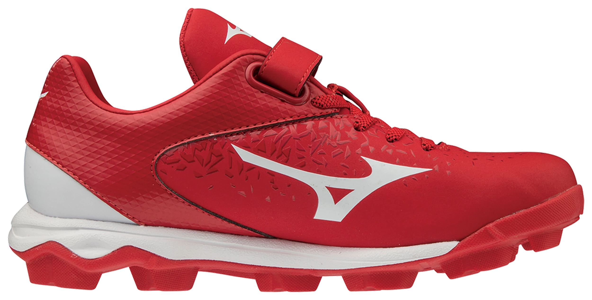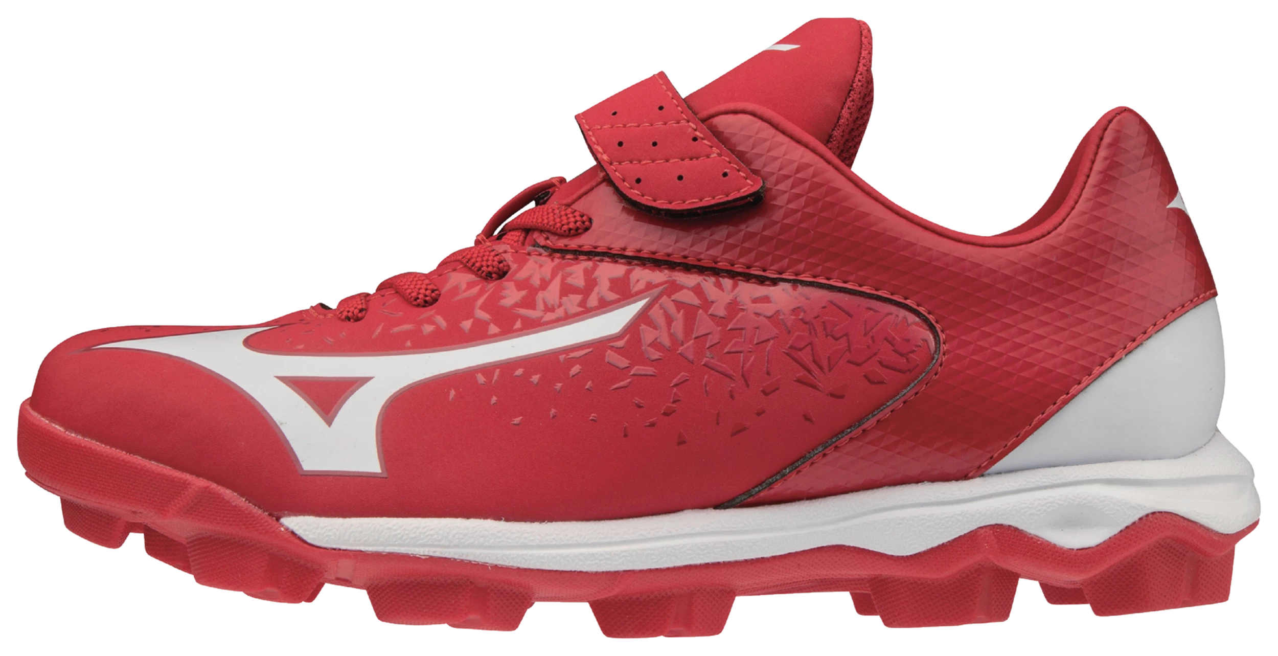 The Mizuno Select Nine JR is a top rubber molded youth cleat option suitable for all field types, while offering an EVA midsole for enhanced comfort and durability. Also features Mizuno Wave technology to reduce pressure, while adding comfort and stability during athletic movements around the diamond. Features one Velcro strap and faux laces add a convenience detail to do away with between-inning shoe tying!