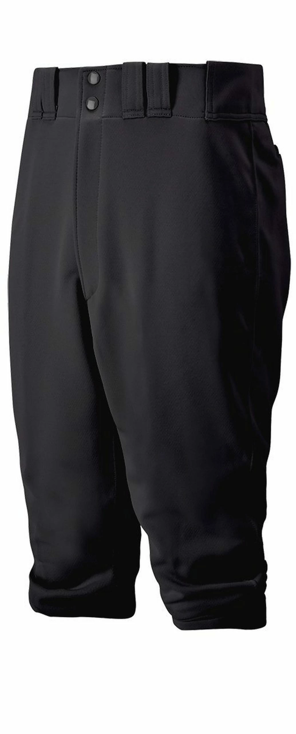 Material 100% Polyester Double Knit Features Shorter inseam to be worn just below knee Tunnel-belt-loop waist Fly front with extended two-snap closure Two set-in back pockets with button closure Double knee Elastic bottom