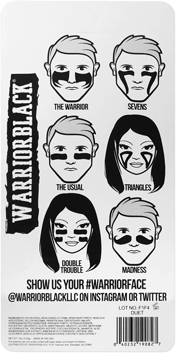Original WARRIORBLACK anti-glare formulation coupled with a pink variant to represent breast cancer awareness.2.4 grams per side: 4.8 grams total.